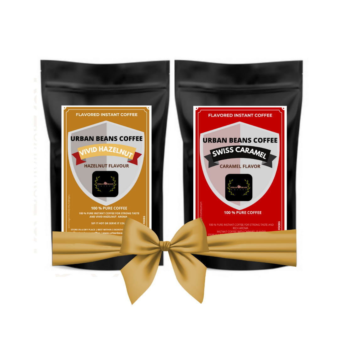 A Combo of our Top Seller Instant Coffee flavors. Vivid Hazelnut and Swiss Caramel packs of 50 gm each. The freshness of this coffee and its flavors are perfectly balanced for an amazing experience. Brew it as a Hot Brew or a late evening cold dessert.